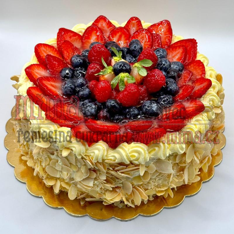 Váha: cca 1,7kg Náplň: Všechny druhy Ozdoba: Lehký krém, sezoní a kopotované ovoce Cena: cca 800,- osypáno v mandlových plátcích